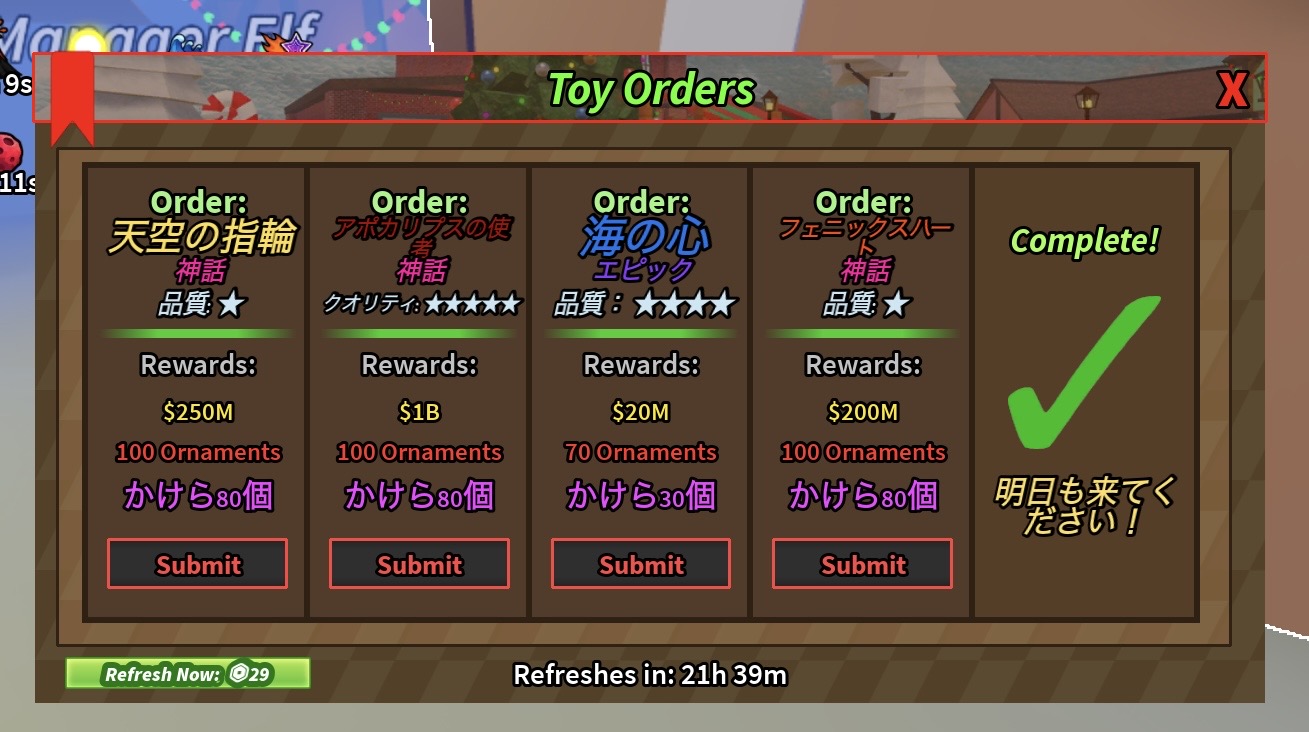 ・品質が上がるともらえるオーナメント数が多くなりますが、品質160~200%程度で80~120ぐらいです。品質の数値が同じぐらいでも、もらえる数には毎回バラつきがあるのでこまめに回収&投入するのが良いです。